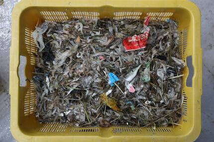 지난 11일 인천광역시 강화군 하점면 창우포구앞 바다에서 건져올린 그물에 40여 년 전에 버린 과자봉지 등이 담겨 있다.