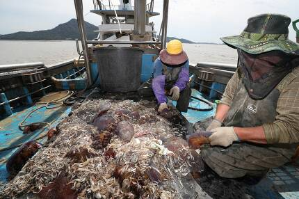 1977년 만들어진 ‘자야’와 ‘뽀빠이’의 비닐봉지가 원래 모습 그대로 새우·물고기 등과 함께 올라왔다.